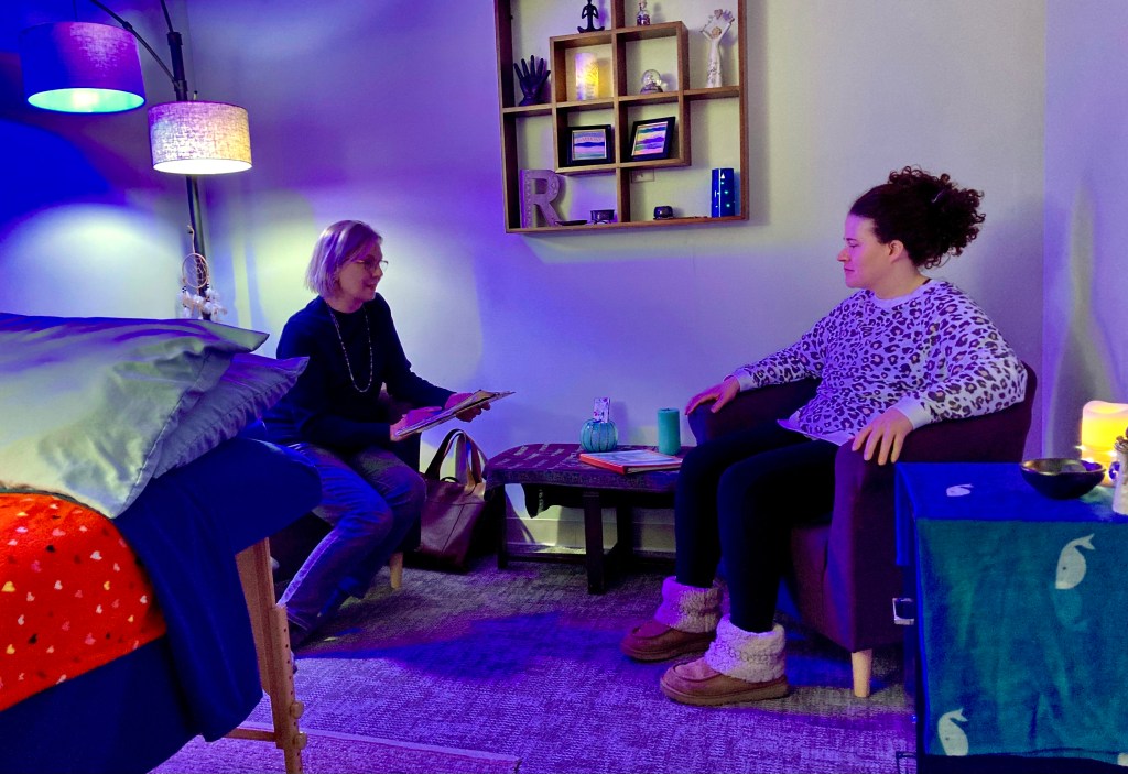 Body centered interview with chakra connection. Client shares life experiences while practitioner guides focus through individual energy field.